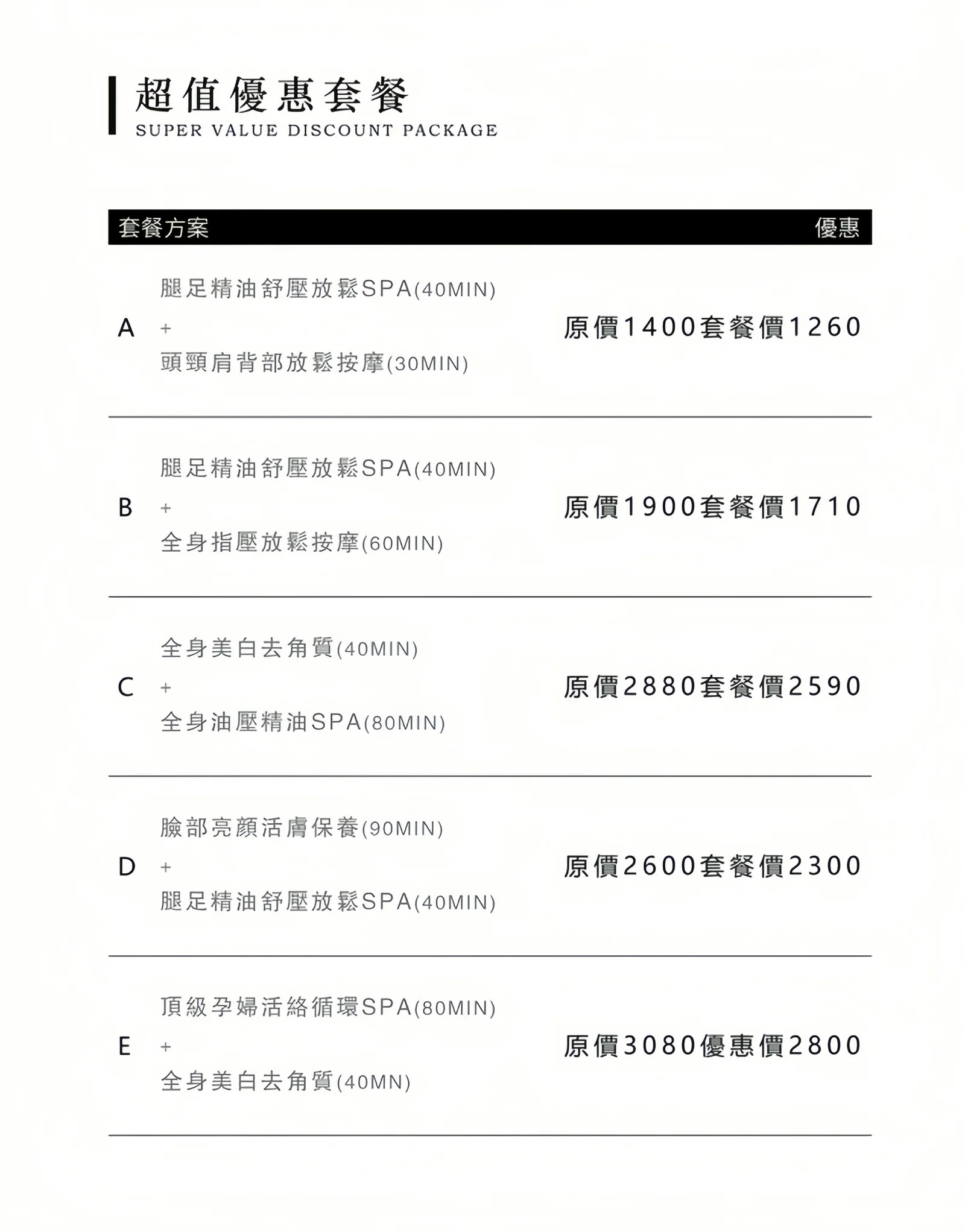 服務項目 SERVICES 按摩系列 Massage Series 頭頸肩背放鬆按摩 30min/600元 Basic Massage (Head, Neck, Shoulder & Upper Back )首まわり、 背中リラックスマッサージ 課程特色:在有限的時間內,運動指、掌、肘等手法進行穴道疏通及經絡放鬆,快速緩解現代人最常出現的:頭痛、脖子緊、肩膀僵硬、腰酸背痛等問題。 腿足精油舒壓放鬆spa 40min/800元 Relaxing Foot & Leg massage SPAレッグオイルマッサージspa 課程特色:專業引流按摩手法,遵循淋巴經絡肌肉軟組織,由腳底經小腿至大腿正反面,將沉積於身體末梢的垃圾快速代謝,改善腿部水腫效果明顯。 全身指壓放鬆按摩 60min/1100 元 Relaxing whole body Massage全身指圧リラクスマッサージ 課程特色:由專業的推拿老師,按照不同的身體狀況,靈活運用指、掌、拳、肘等不同深度的推拿手法,對身體的經絡及穴道進行細膩又完整的按摩,達到促進末梢回流、加速新陳代謝,放鬆身心的效果。 全身油壓精油按摩 80min/1600元 Whole Body SPA with Essential Oil全身アロママッサージspa 課程特色:法國進口芳療級純植物精油融合老師專業芳香按摩手法,遵循淋巴、經絡、肌肉軟組織,由淺至深放鬆身體的每一吋肌膚,釋放身心疲憊和保養全身肌膚。 美麗再現 The return of beauty 全身美白去角質 40min/1280元 Body Whitening Scrub全身美白角質取り 課程特色:獨家配方,溫和軟化角質;專業手技放鬆每寸肌膚,為肌膚深層清潔快速代謝角質,避免手臂和大腿外側雞皮行成。搭配保濕乳霜,呈現肌膚健康光澤。 胸腹引流精油spa 40min/1280元 Chest&Abdominal Lymph Essential Oil Massageバストとお腹のリンパオイルマッサージ 課程特色:本療法運用4種專針對胸部和腹部的精油配合專業的豐胸、引流、減腹脂按摩手法,達到乳腺組織疏通、胸部營養供及促進腸胃乳動、緊實腹部的效果。 孕媽咪專屬 Prenatal Massage 專業孕婦指壓按摩 60min/1200元 Professional Prenatal Acupressure Course妊婦指圧リラクスマッサージ 課程特色:為了減緩孕期引起身體不適症狀,我們搭配為孕婦所專門研發的手法,遵循適合按摩的經絡穴道,對頭頸肩背腰和腿的肌肉軟組織及經絡穴道進行專業的按摩放鬆,以達到改善末梢循環降低孕期不適的效果。 頂級孕婦活絡循環spa 60min/1200元 Ultimate Relaxation Prenatal Oil Massage妊婦オイルマッサージ 課程特色:減緩孕期引起之身體不適症狀;搭配孕婦專門精油,改善肩頸肌肉僵硬 、腰部痠痛、消除腿部腫脹 、促進血液循環。達到:放鬆神經 ,舒緩減壓,保濕護膚 ,預防產後妊娠紋產生等效果。您所擔心的我們都已想到。 臉部保養 Facial Care 臉部亮顏活膚保養 90min/1800元 Facial Care - Skin brightening & hydrating sessionフェイシャルケア 課程特色:使用整組法國進口的天然抗敏保濕系列產品+韓國引進最新皮膚綜合管理儀,從臉部深層清潔-去除老化角質-粉刺豆豆清除-緊緻提拉按摩-肌膚深層膠原蛋白補充到客制化面膜護理等一系列針對面部肌膚的專業保養。恢復臉部的Q彈好氣色。 暖宮排寒 Womb Warming Therapy 負壓排寒刮痧拔罐 20min/1200元 Thermal energy scraping and cupping真空熱エネルギーによるカッサとカッピング 課程特色:吸痧刮痧、溫宮暖胃、拔罐走罐、物理熱療、排寒祛濕、美體塑形、升級吸力、調養身心 加購價499元 超值優惠套餐 Super Value Discount Package